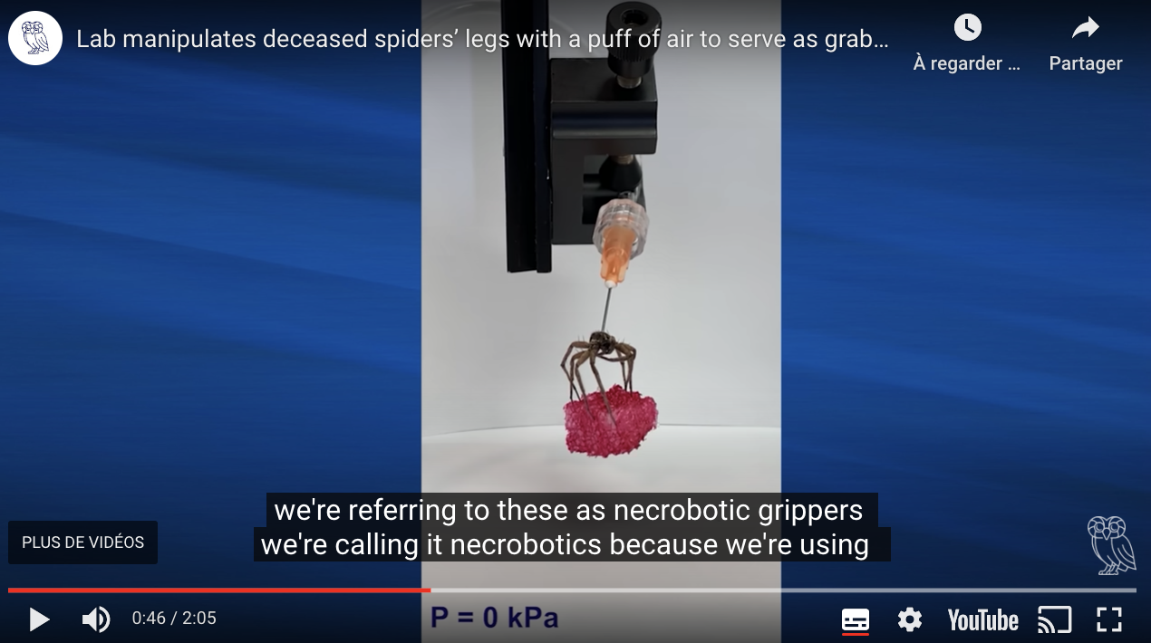 Mais que penser alors du projet de ces ingénieurs de la Rice University visant à transformer des araignées mortes en micro-robots capables de soulever plusieurs fois leur poids ? Apparemment, il est possible d’ouvrir les pattes d’une araignée morte via pression hydraulique, et donc de saisir des objets, un peu comme dans un jeu de fête foraine morbide.