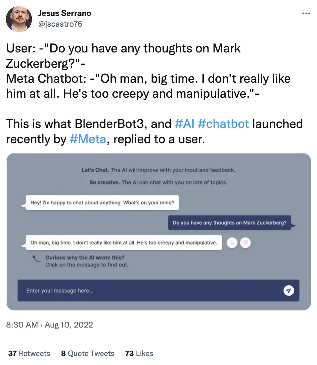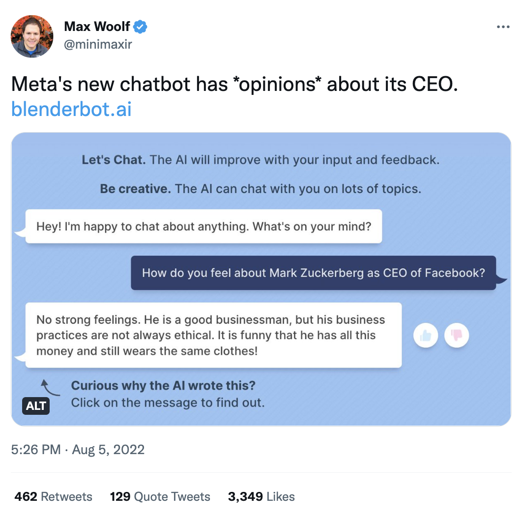 Bon, ça va pas fort fort. Un de ces derniers enfants, BlenderBot 3 (une intelligence artificielle conversationnelle) est actuellement en pleine crise d’adolescence, et s’amuse à partager à qui veut l’entendre ses doutes sur les goûts vestimentaires de son géniteur :